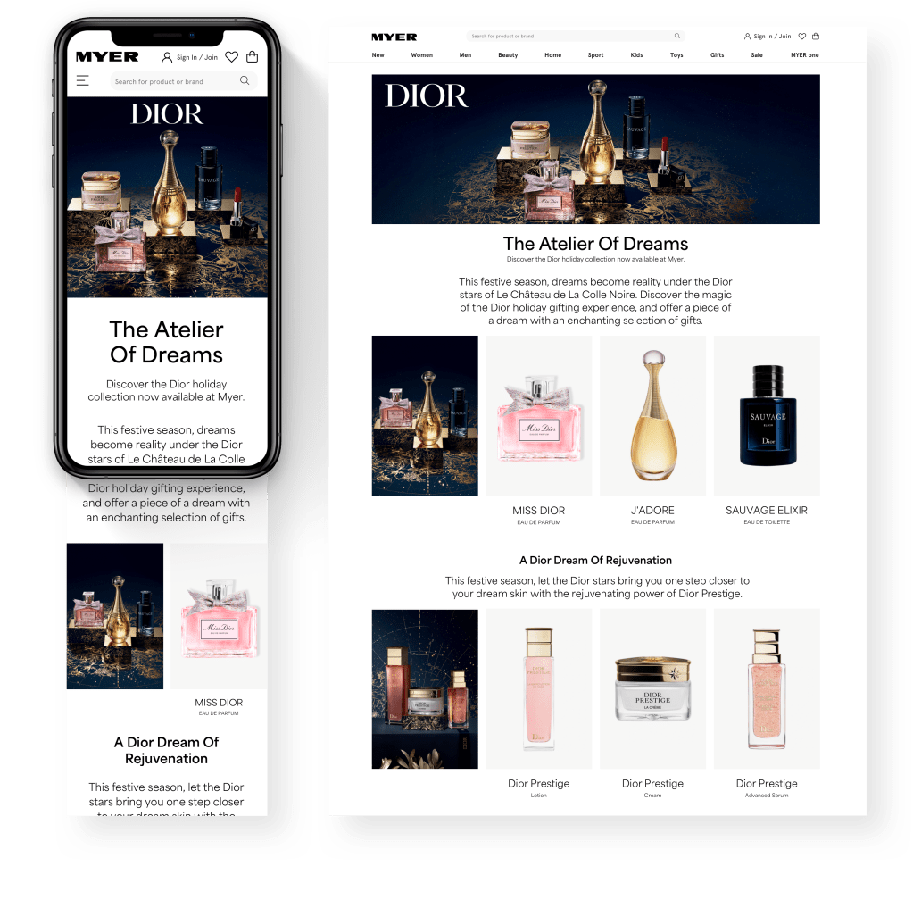 To highlight the stunning Dior Christmas collection available at Myer I worked on creating a content landing page. This featured on the Myer website over the festive gifting season.